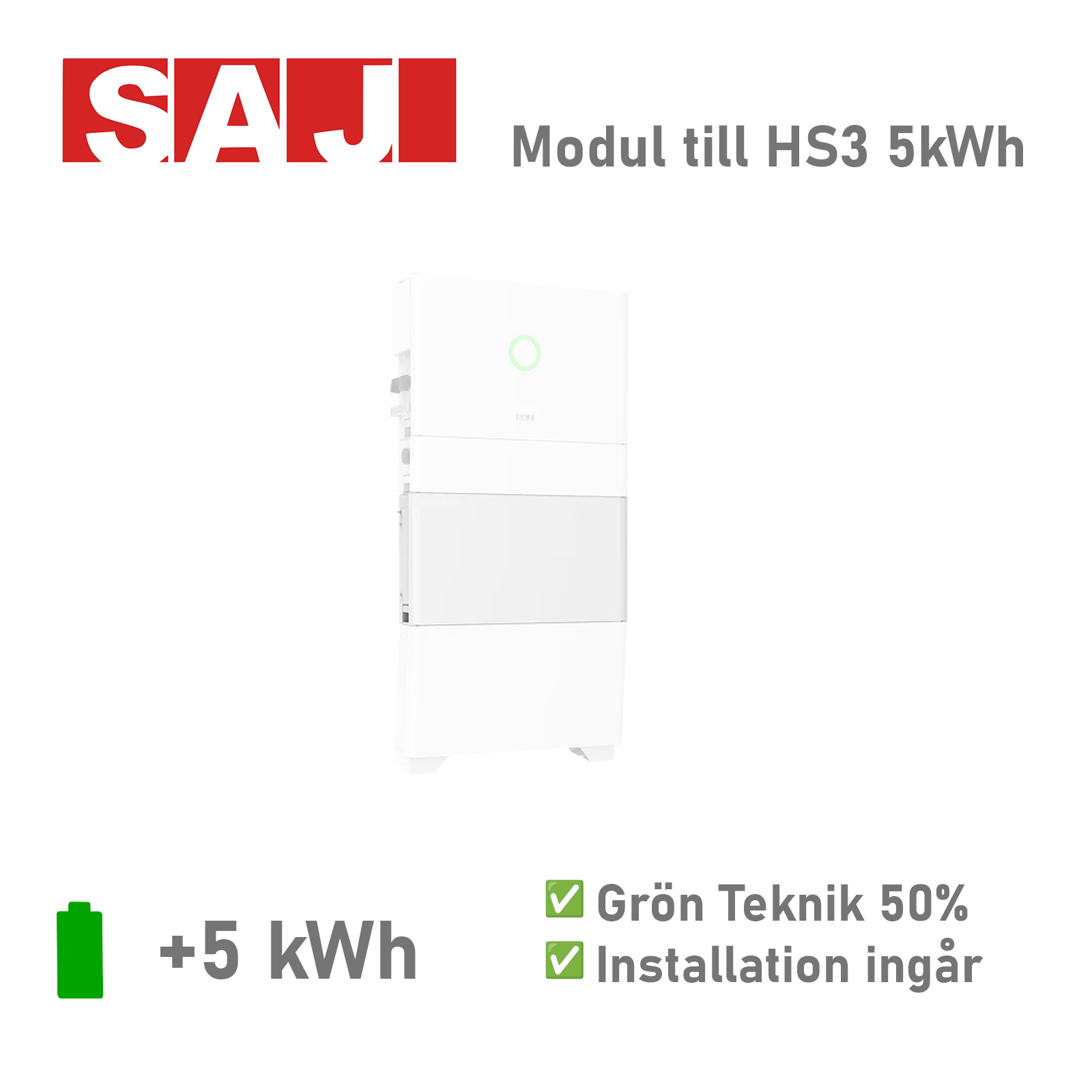 SAJ HS3 5 kWh är en litiumjärnfosfat-baserad (LFP) batterimodul avsedd för HS3-serien. Modulen fungerar både som startmodul och som expansionsmodul och kan staplas upp till 40 kWh per system.